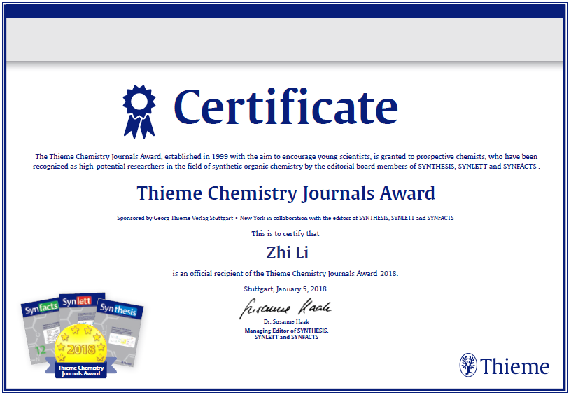 近日,小妲己直播 李智教授获得2018年度“ThiemeChemistry Journals Award”学术奖项。该奖项设立于1999年,每年由Thieme杂志社化学领域著名期刊Synlett、Synthesis及Synfacts编委会联合推荐,颁发给世界范围内有机合成与催化领域崭露头角的青年学者。祝贺李智老师!