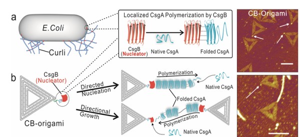 在修饰了成核蛋白CsgB的DNA折纸结构的引导下,大肠杆菌生物被膜淀粉样蛋白CsgA能够定点加速聚合;AFM高度图显示纤维从CsgB-DNA复合物顶点开始生长。白色箭头表示在顶点形成的点状寡聚物。标尺:100nm