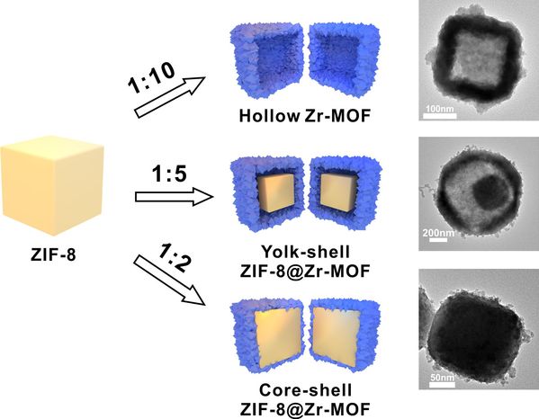 图3:空心壳(上)、蛋黄壳(中)和核壳(下)金属有机框架材料的制备
