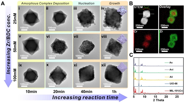 图2:核壳MOF:MIL-101(Cr)@UiO-66在不同阶段的生长状态