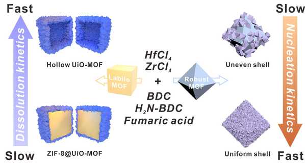 图1:两个动力学因素影响核壳MOFs生长的示意图