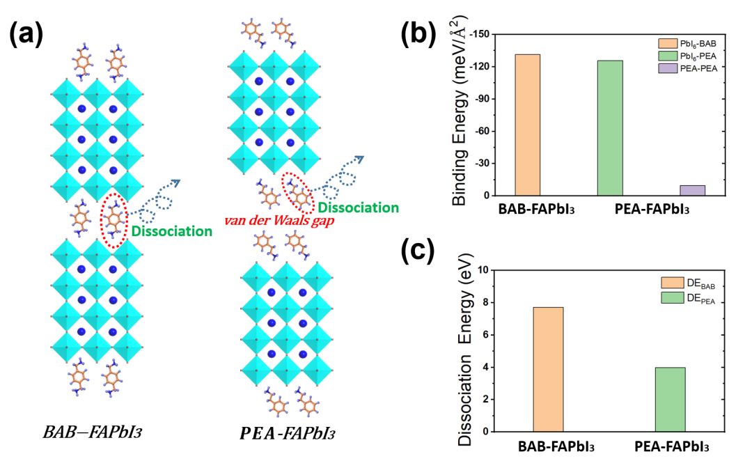图1. (a)双氨基分子(DJ结构)和单氨基分子(RP结构)与层状无机钙钛矿的结合示意图;(b) 理论计算的结合能;(c)理论计算的分离能