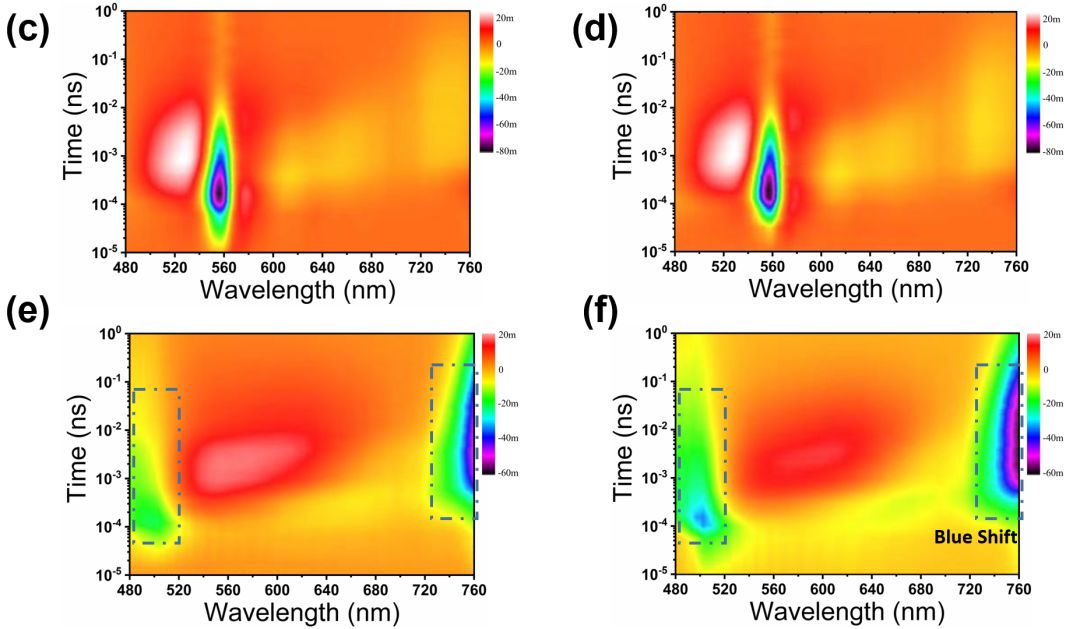 图2. Dion-Jacobson结构(c, d)和Rddlesden-Popper结构(e, f)在器件工作之前(c, e)和工作100小时后(d, f)的瞬态吸收光谱对比