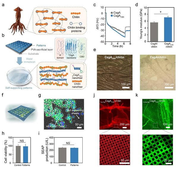 这项基于超稳定淀粉样蛋白的图案化加工技术可推动生物纳米、生物材料、生物制造等多领域的创新。事实上,随着生物技术的发展,理论上各种功能基团都能够被展示在CsgA纳米纤维图案上,因此,这些具有可基因编程特征的图案化材料有望在光学、电子学、组织工程、生物医药等多领域中找到相应的应用。
