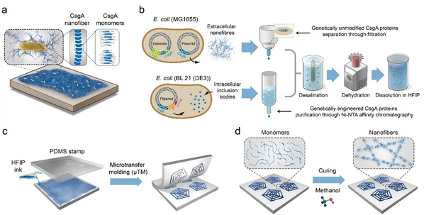 利用蛋白质分子作为基本构筑材料、通过理性设计和微纳加工制备出的图案化结构或材料,已被证明在生物光子、生物电子、生物传感、生物医学和组织工程等诸多领域有重要应用。然而现有蛋白图案化材料的应用却往往受限于其在恶劣环境下的不耐受性,同时当前图案化蛋白材料的应用尚未充分利用其功能可被基因工程编程的特点。在自然界中,细菌生物被膜能在恶劣环境下实现界面粘附并维系自身必要的生长。以大肠杆菌生物被膜为例,当细菌以生物被膜的形式存在时,细菌的极端环境耐受性要大大增强,而在其中起着至关重要的是一种CsgA纳米纤维(图1)。CsgA纳米纤维由CsgA单体蛋白自组装而成,它富含β-折叠结构,是一种典型的淀粉样蛋白,具备极强的环境耐受性(例如可以耐高低温、酸碱溶液、有机溶剂以及一定的机械摩擦)。此外,利用基因工程可以实现CsgA单体蛋白的功能化修饰,即功能化的短肽和蛋白功能域能够融合在CsgA单体蛋白上,同时融合的蛋白在保持原有功能的基础上又不影响CsgA蛋白本身自组装形成纳米纤维的能力。基于这些特点,钟超课题组提出利用CsgA纳米纤维作为基本构筑单元,构建新一代的兼具耐受和功能可调节的图案化蛋白材料。