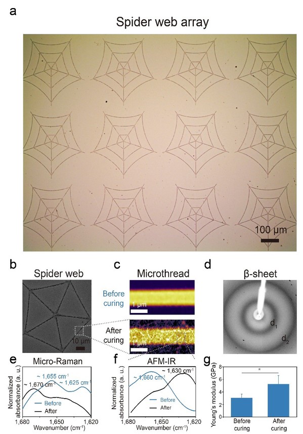 在课题初期阶段的尝试中,研究人员发现CsgA纳米纤维的极强环境稳定性导致其不能完全溶于水,从而很难利用水溶液体系加工出高精度的图案化结构。为解决上述难题,课题组巧妙地利用了六氟异丙醇 (HFIP) 作为极性溶剂对其进行溶解,并将富含蛋白单体的HFIP溶液作为墨水,利用软刻蚀进行图案化加工,再结合甲醇进行蛋白的原位复性,最后得到结构稳定的蛋白图案。在具体实验中,研究人员首先利用软刻蚀方法加工出了基于CsgA纳米纤维的蜘蛛网图案,并表征了图案化结构具备着从原子级别到厘米级别的多级有序性(图2)。其次,以平行线阵列为代表性图案化结构,研究人员利用原子力显微镜等技术证实了CsgA纳米纤维图案在一系列的稳定性测试中展现出极强的化学、热和机械耐受性。