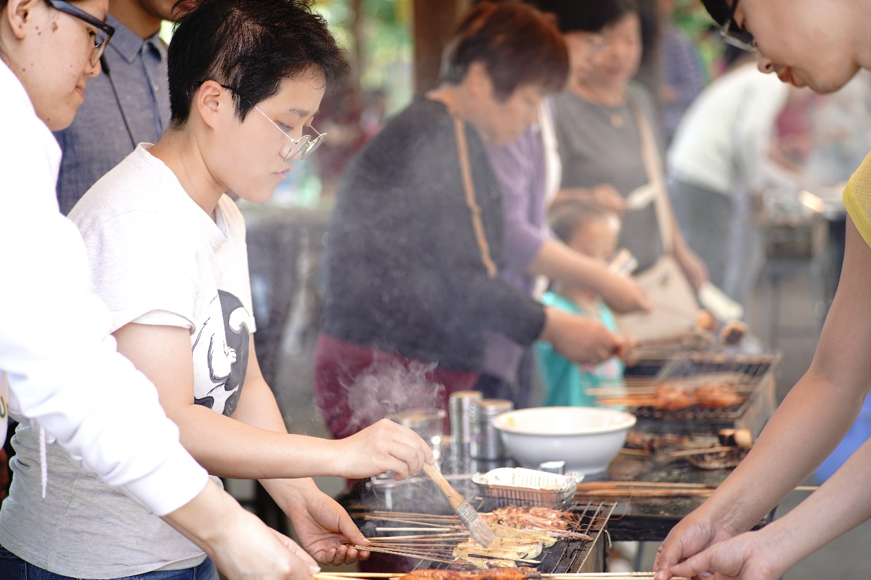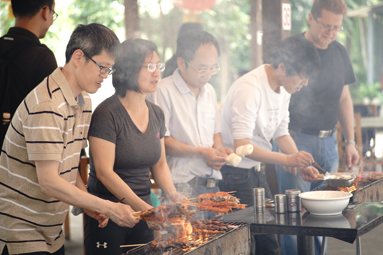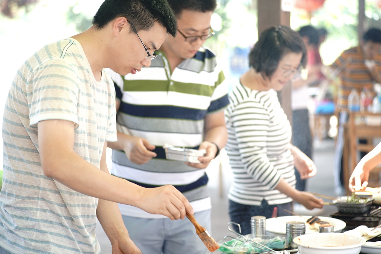 接近中午,大家从广富林遗址公园出来,再一起去烧烤。生起炉子,穿好串,抹上油,大家一边烤一边聊,相谈甚欢!一个个都俨然烤羊肉串老板范儿!平常在家不下厨的男同事们也上手啦!