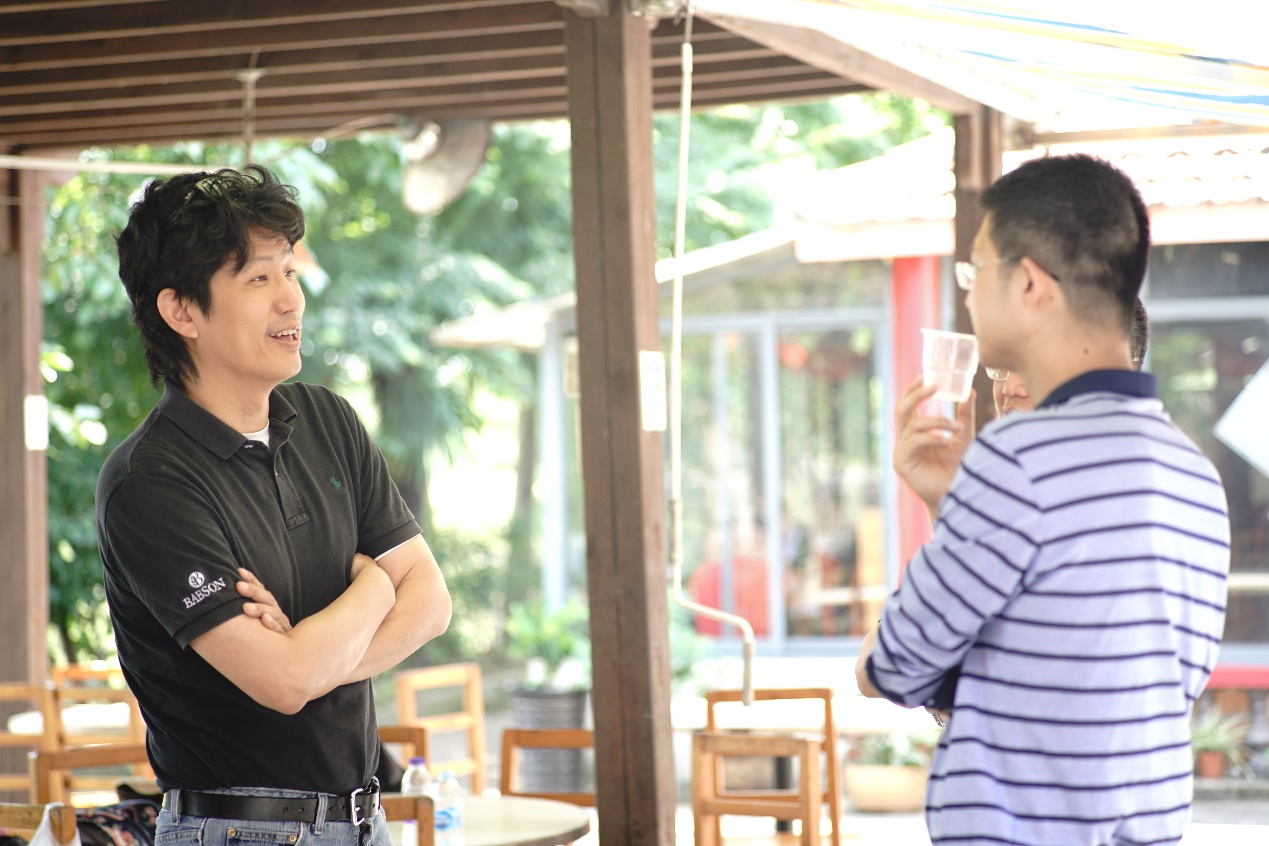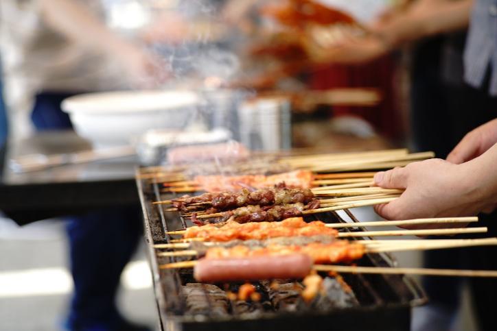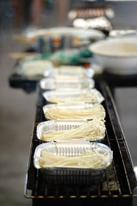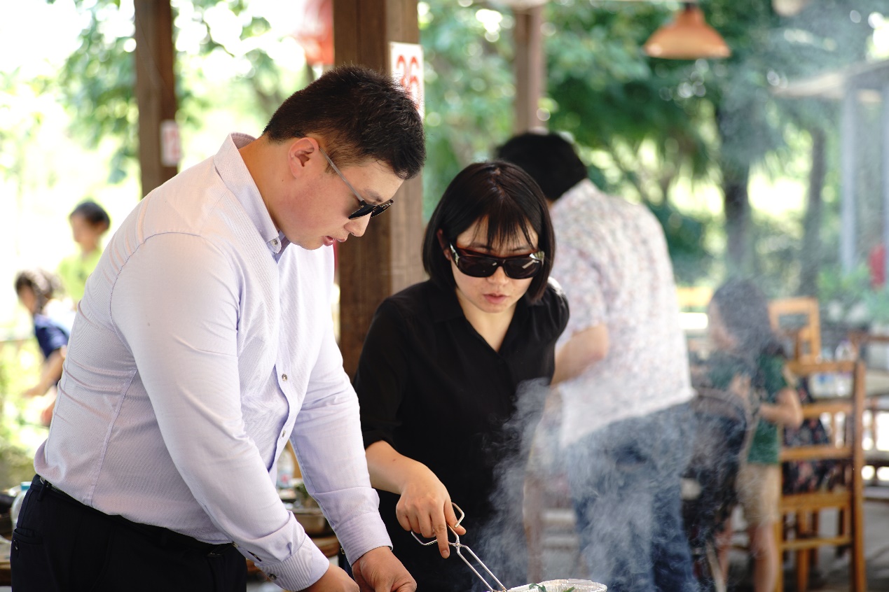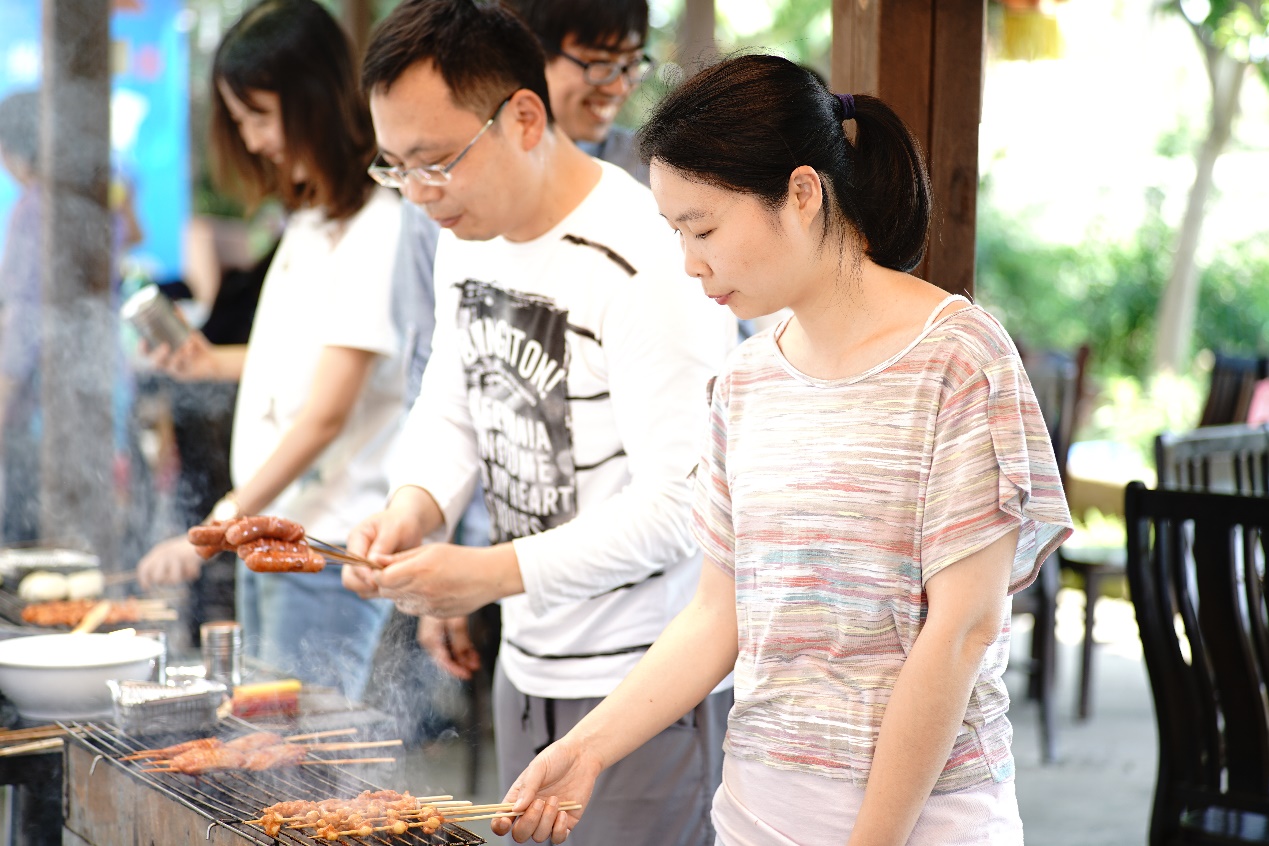 接近中午,大家从广富林遗址公园出来,再一起去烧烤。生起炉子,穿好串,抹上油,大家一边烤一边聊,相谈甚欢!一个个都俨然烤羊肉串老板范儿!平常在家不下厨的男同事们也上手啦!