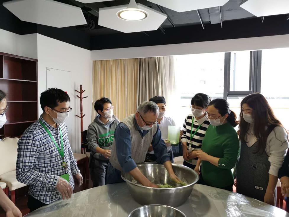 面和好后,大家就一起挽起袖子开始包青团了!每一个青团剂子都要过称,约60g重,老师们发扬科研精神,要求非常严格,误差在±2g以内,将剂子揉成圆球,再小心地在中间凹个小洞,把馅料填进去,最后再慢慢收口,揉圆。看似简单,做起来也是有技巧的呢,大家一边做一边互相交流经验。