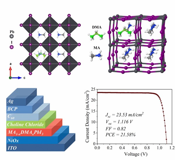 器件采用p-i-n反式结构,以氧化镍为空穴传输层,C60为电子传输层,氯化胆碱为钙钛矿薄膜钝化层,在AM1.5 G模拟太阳光的照射下,器件效率可以达到21.58%。