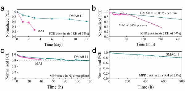 (b) 未封装MAI与DMA0.11器件在相对湿度为65%的空气中MPP稳定性比较。