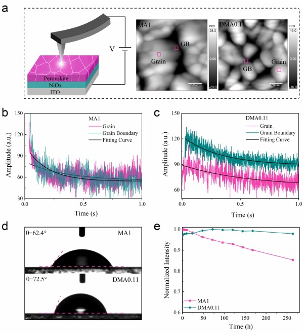 (c) 在-2V 偏压下,DMA0.11薄膜中晶界与晶粒的ESM振幅随时间变化的示意图。