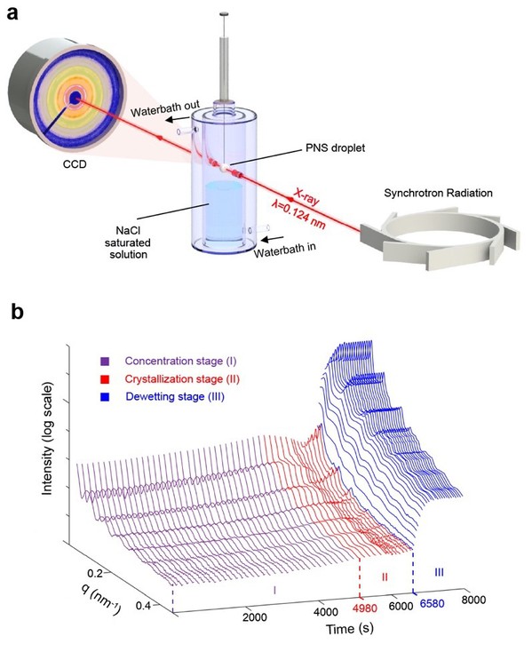 近日,我校小妲己直播 陈刚教授课题组在胶体纳米颗粒自组装研究方面再次取得重要进展。该研究应用同步辐射X射线小角散射(SAXS)手段,原位观测了胶体液滴的蒸发自组装过程,揭示了胶体粒子的结构演变和蒸发动力学过程。日前,该成果以“Dynamic Crystallization and Phase Transition in Evaporating Colloidal Droplets”为题,在知名学术期刊《Nano Letters》上在线发表。