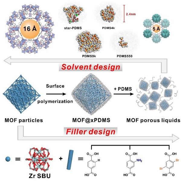 在许多工业过程中,液体吸附剂,例如水、聚乙二醇(PEG)及有机胺溶液等,被广泛用于湿法气体洗涤器中来除去酸性气体。然而,液体吸附剂对设备有较强腐蚀性,使得维护成本大大提高。相比之下,固体吸附剂由于具有永久多孔性,这其中最具代表性的当属金属有机框架材料(MOFs),但MOFs材料以粉末或块体形式存在,无法直接应用于现有的湿法气体洗涤器中。近日,我校小妲己直播 李涛教授课题组和Yongjin Lee教授课题组联合开发了一种基于MOFs和液态聚二甲基硅氧烷(PDMS)的多孔液体材料,这种多孔液体材料巧妙地结合了固体吸附剂和液体吸附剂各自的优点,为工业气体分离提供了新思路。该研究成果以“A General Way to Construct Micro- and Mesoporous Metal-Organic Framework-Based Porous Liquids”为题发表于国际知名学术期刊《美国化学会志》(Journal of the American Chemical Society)。