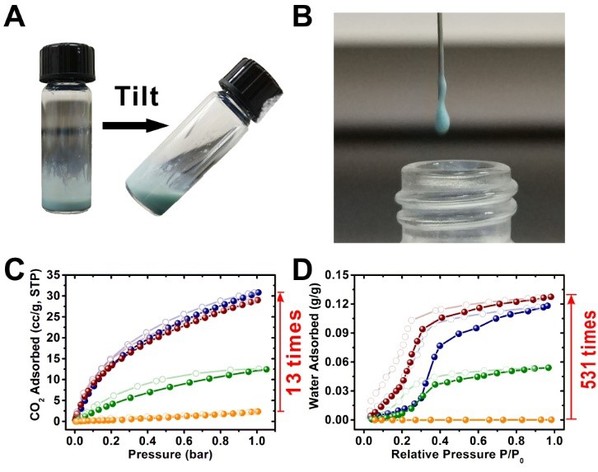 图2. (A)(B)多孔液体的照片;(C)(D)分别为多孔液体储存三个月后在273K下二氧化碳的吸附等温线和298K下水蒸气的吸附等温线。相比于纯PDMS溶剂,多孔液体二氧化碳和水蒸气的吸附量分别提高了13倍和531倍。