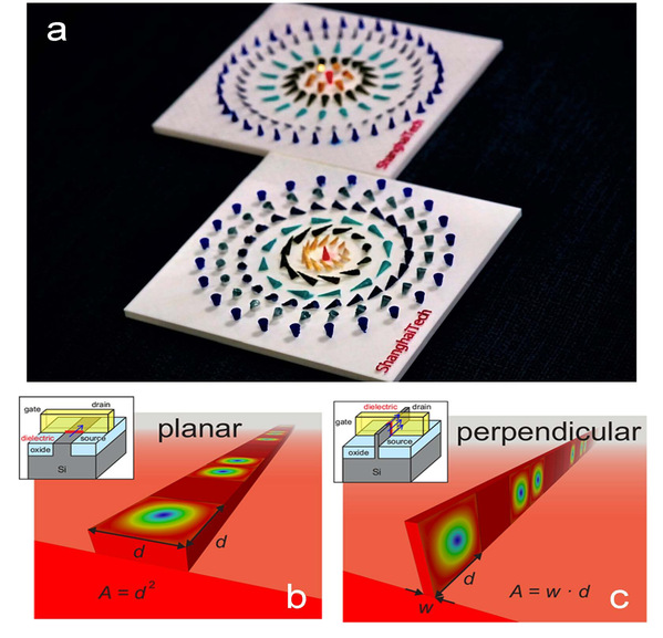 a 两类斯格明子在实空间的漩涡状自旋排列(3D打印模型);b,c 传统面内斯格明子 vs 新型垂直斯格明子赛道存储器示意图