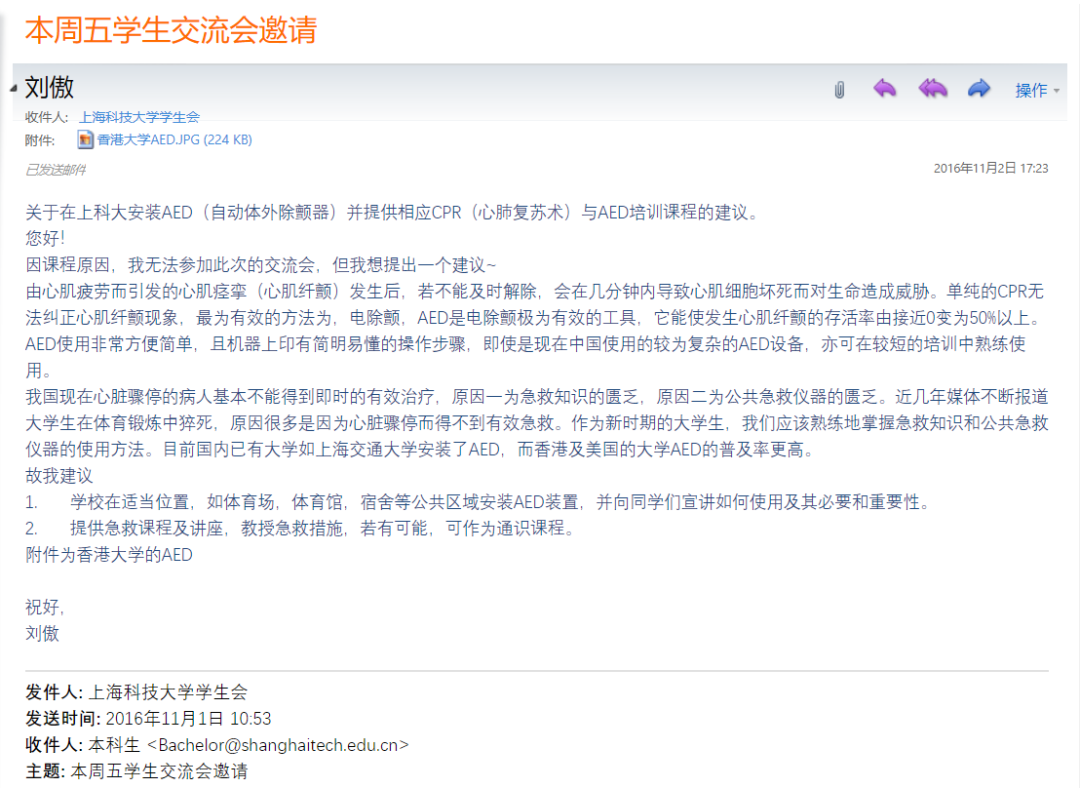 作为新学校,上科大还很年轻,也有需要完善的地方,但和大多数我周围的朋友一样,我对上科大有着强烈的归属感。因为这是一所能够真正倾听学生声音的学校,我们会在各个方面提出自己的观点和感受。比如,小妲己直播 行政管理团队认真听取了我们这一届学生对物理专业的培养方案的建议;又比如,目前学校公共场所醒目位置安装的AED,是因为四年前我的一篇邮件而发轫。这样的聆听和互动让我感到自己不单单只是一名在校四年的一名“路人”,而是校园的主人翁、建设者和传承者。