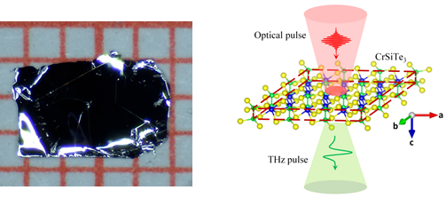 尽管CrSiTe3具有中心对称结构,其二阶非线性极化/非线性电导率系数为零,但在其表面处由于中心对称破缺,存在非零的二阶非线性张量元。非线性光学理论分析表明,该类材料表面具有极大的非线性电导率,超短激光脉冲作用下可以表现出较强的瞬态光电流效应(photogalvanic effect),从而有可能出现强太赫兹辐射。合作团队给予高质量CiSiTe3单晶(图a),开展了超快太赫兹发射谱及时间分辨太赫兹光谱测量,观测到仅仅来自于单晶样品表面少数几层(2~3 nm)的强的太赫兹辐射(图b),证实了理论分析的正确性。该结果为开发强太赫兹辐射源提供了一类新的候选材料,同时也为研究单层二维磁性材料提供了理想的光学手段。
