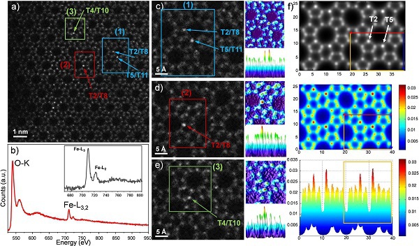 另一方面,分子筛中取代性的杂原子往往能提高其催化性能,其在框架中的位置及分布同样至关重要。对此,该研究团队首先也同样通过ABF成像观察到了框架中的O原子和Si原子,并且还通过ADF成像,结合电子能量损失谱、三维电子衍射、图像模拟等手段,首次确认了框架中取代性Fe原子的存在及位置,判定了其非周期性分布、非特定位置取代的特性。