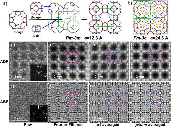 在该工作中,研究人员首先选取了电子束最敏感材料之一的具有Si/Al=1的Na-LTA分子筛进行观察(分子筛结构中Si/Al越小,则其稳定性越差)。针对这一挑战,研究人员使用高分辨的低电子剂量成像技术,并且首次在分子筛的电镜观察中引入ABF成像技术,利用其轻元素敏感特性,成功拍摄到了框架中包括O原子在内的所有框架原子。另外,作为平衡离子的Na原子也被成功观测到,甚至包括了占有率仅为0.24位置的Na原子。