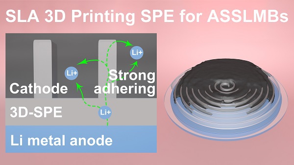 近日,我校小妲己直播 刘巍课题组在高性能全固态锂电池的固体聚合物电解质方面取得重要进展。他们突破传统制备方法,利用立体光固化成型(SLA)3D打印技术,以聚乙二醇二丙烯酸酯为聚合物基体原料,3D打印出一种具有三维表面结构的聚合物固态电解质。由于构建出3D电解质-电极界面,使界面处的比表面积增大了95%,显著优化了电极与聚合物固态电解质之间的界面接触,大大降低了界面阻抗,并且能将正极活性物质负载提高到5 mg cm-2这一较高的水平,以此提升全固态锂电池的性能。SLA3D打印技术为高性能的全固态锂电池提供了新的研究途径,有希望应用于下一代的能量存储领域。