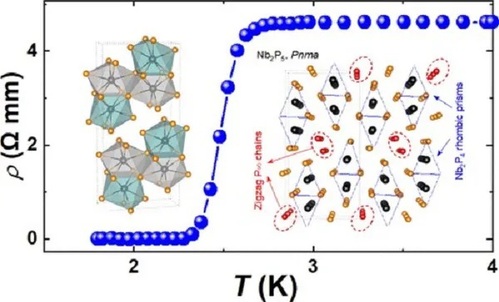 其中一个探索点是对富磷的补偿型半金属进行结构的调制。补偿半金属具有极大的正磁阻效应,同时电子能带结构具有弱拓扑绝缘体特征,在磁场下由于塞曼劈裂会导致外尔态。郭艳峰课题组利用高压制备手段,在补偿半金属NbP2中的Nb2P4菱形三棱柱中沿着b轴(图2)嵌入了一条无限长的P链,成功制备了富磷化合物Nb2P5单晶。样品的低温电阻、磁化强度、比热等测试结果表明Nb2P5的超导转变温度为2.6 K为第II类超导,其超导能隙具有s波对称性。该结果表明插入磷链成功在补偿型半金属NbP2中诱导了超导电性。此外,第一性原理计算表明,超导的Nb2P5中由于能带翻转可能形成了非平庸拓扑节线结构,有望作为拓扑超导候选材料。这项工作展现了大腔体压机探索新超导材料的潜力。