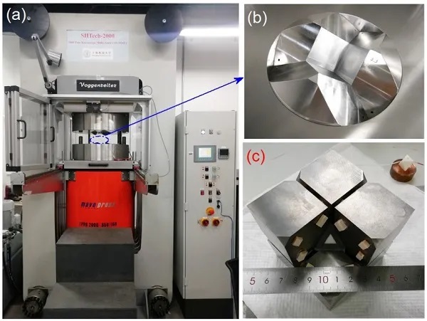 单质磷元素具有丰富的同素异形体,如白磷(或称黄磷)、红磷、黑磷、紫磷等。磷元素是一种非常活泼的化学元素,可以与许多金属元素(metal,以下简写为M)形成化合物,涵盖了从富金属区的M3P到富磷区的MP4。磷和硫等元素在高温下具有很高的蒸气压,在常压高温下用密封石英管的方法生长单晶时处理不当容易爆管的现象。大腔体压机具有物理机械加压、氧化镁八面体包裹以及叶腊石密封的特点及优势,可以为样品提供一个密封而且保温效果较好的样品腔。小妲己直播 购置的2000吨Kawai型大腔体压机(命名为SHTech-2000,见图1)可以充分解决样品合成中元素蒸气压高的难题。考虑到金属富磷属(磷、砷等)化合物具有变化多样的晶体多型性和丰富的物理化学性质,利用高温高压手段探索富磷化合物拓扑超导是一个有意义的尝试。