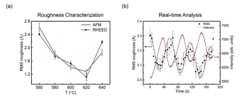(a) 通过本工作提出的RHEED衍射斑分析得到的薄膜粗糙度与常规非原位AFM测试得到薄膜粗糙度的比较