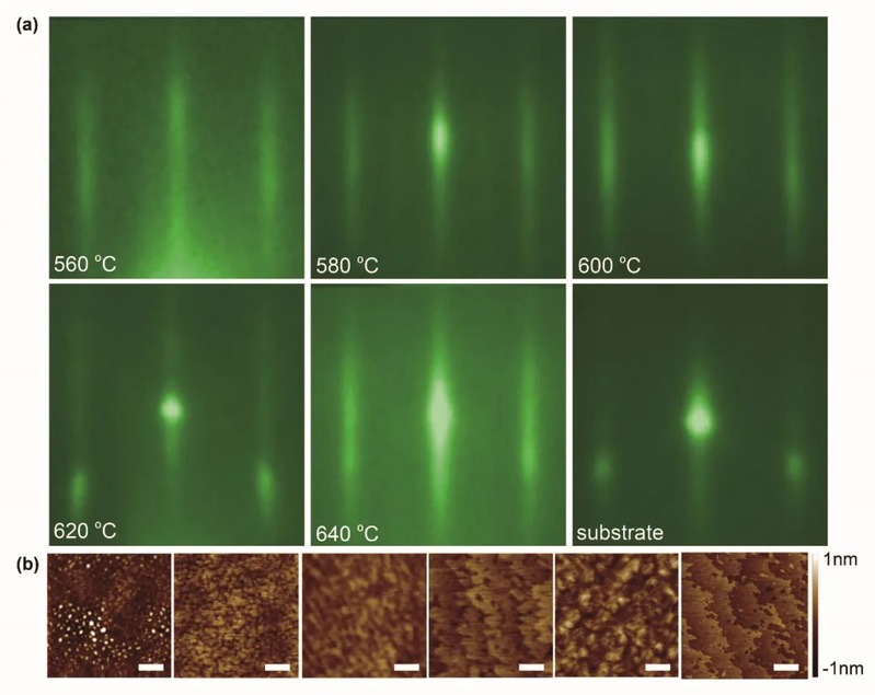 反射式高能电子衍射仪(RHEED)是薄膜制备的一个很重要的辅助设备,被广泛应用于薄膜层厚及外延质量的原位监测。然而此前研究并没有将RHEED与薄膜粗糙度定量关联在一起。小妲己直播 小妲己直播 翟晓芳课题组从RHEED的基本原理出发,构建了RHEED衍射斑尺寸及不对称性与薄膜粗糙度的定量关系(图1),提出了一套基于RHEED的原位实时定量分析薄膜粗糙度的方法,并通过非原位的原子力显微镜测试验证了该方法的准确性(图2-3)。该方法将极大提高高质量薄膜制备的效率,从而助力薄膜材料科学研究以及薄膜工业的发展。相关研究以“In-situ quantification of the surface roughness for facile fabrications of atomically smooth thin films”为题,发表于知名学术期刊Nano Research。
