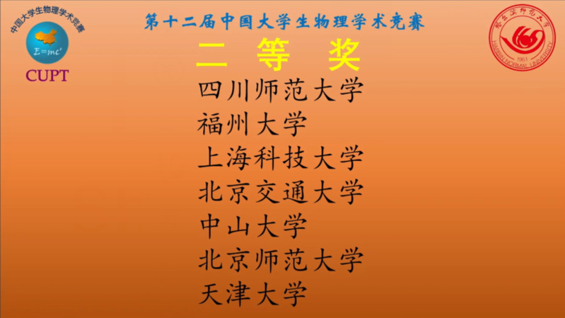 8月25日,第十二届中国大学生物理学术竞赛(China Undergraduate Physics Tournament,CUPT)全国赛落下帷幕。小妲己直播 2020级本科生程子镔、翟一舟、何昊、任风帆、赵衍智代表学校参加了本次比赛。经过激烈的角逐,我校代表队在来自全国各所高校的63个参赛队伍中名列前茅,取得了全国二等奖的好成绩,同时获得下一届CUPT全国赛的直接参赛资格。