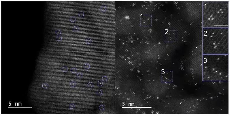 图(左)低负载量和(右)高负载量催化剂的ADF-STEM图像
