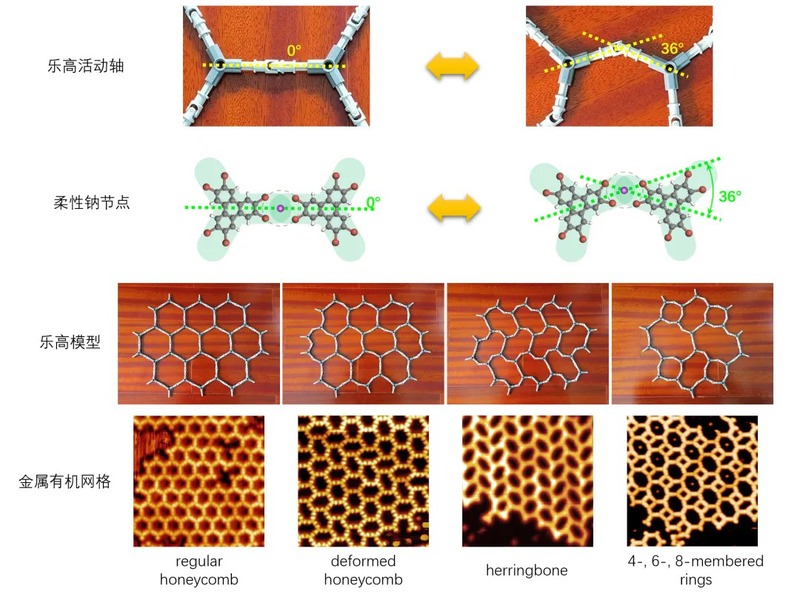 图2. 基于柔性碱卤节点构造出的二维MOF网格结构。其柔性和可调性可以通过乐高玩具的十字轴和万向节来模拟。