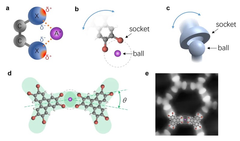 图1. (a-c)邻二卤基团和碱金属离子通过碱卤键构成螯合结构。(b-c)HBT分子中一个邻二溴基团和钠离子构成类似人体肩关节的可活动的分子“关节”。(d)两个HBT分子和一个钠离子构成配位数为2且具有大幅度柔性的金属节点。(e)吸附CO分子的高分辨STM图像可以精确确定分子的相对偏转角度。