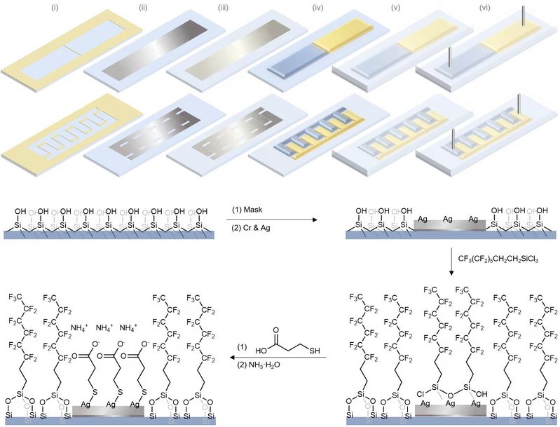 图(上)在载玻片表面制备全水溶液电池的流程示意图:掩模、蒸镀、表面处理、滴加电解质溶液、封装、安装导线和(下)载玻片表面处理。Reused with permission from 10.1021/jacs.1c12417. Copyright 2022American Chemical Society