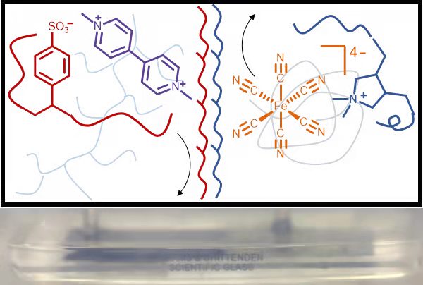 图(上)全水溶液电池组成示意图和(下)充放电过程中的全水溶液电池(蓝黑色为甲基紫精阳离子自由基)
