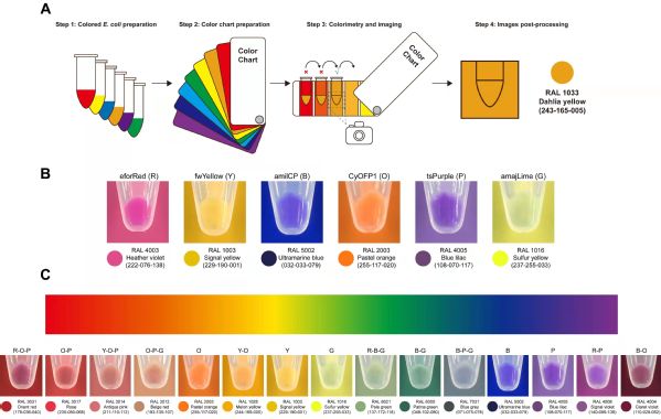 图4 | 大肠杆菌中不同融合质粒表达色素蛋白。(A)菌体颜色标准化流程;(B)六种基础色素蛋白颜色;(C)能够覆盖完整色谱的代表性彩色菌体展示