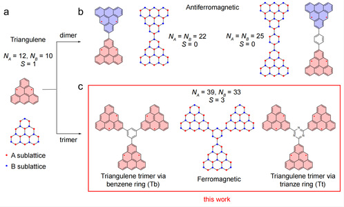 在以往的研究中,多通过苯环或者单键连接形成三角烯结构,该结构中两个三角烯单元之间为反铁磁耦合,AB两种子晶格的碳原子数相同,导致最后净自旋S为0。为了构建三角烯的高自旋体系,需要三角烯单元连接在苯或三嗪间隔体的相同子晶格位置(图1c)以产生子晶格的不平衡,继而产生高自旋基态。然而由于未配对电子的超高化学活性,由溶液或表面方法合成三角烯高自旋体系仍然是一项具有挑战性的任务。