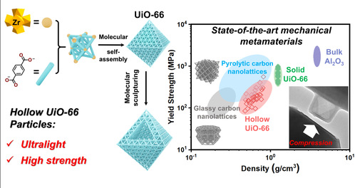 图1,中空UiO-66MOF颗粒作为多级网格材料的合成设计策略以及与先进机械超材料的力学性能对比