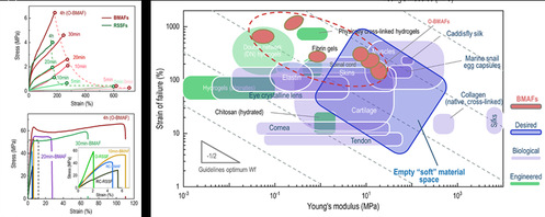 图2:对BMAF进行机械训练获得RSSF的结构重构。a机械训练中的BMAF;b训练后BMAF的形貌(左)与天然丝(中)和训练后的纯RSSF膜(右)对比;c-d通过WAXS和SAXS表征BMAF微观结构演化。通过这种方法制备的BMAFs具有较高的含水量(59±3wt%),表现出典型的韧性材料的力学行为,柔性、可拉伸和韧性等力学特征具有较大范围的可调控性,可在生物组织工程应用中与不同组织相匹配。且其综合力学性能优于大多数不同基质的水凝胶材料与高含水丝蛋白基材料(图3)。
