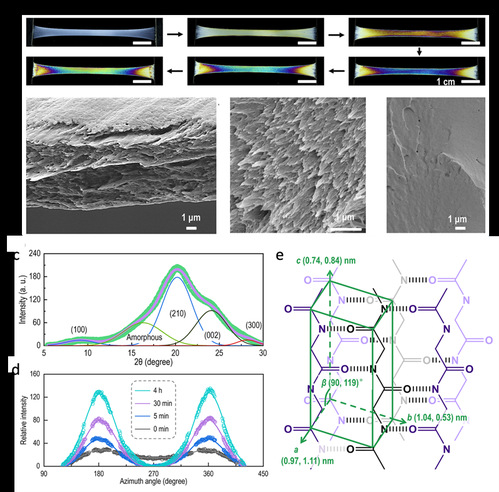 对介观组装薄膜(BMAFs)进行机械训练(反复拉伸),可实现RSSF在介观尺度的结构重塑(图2)。最终RSSF小球演化成直径约为300-500nm的纳米纤维结构,其形态与天然丝中的纳米纤维相似。作者研究了机械训练期间BMAF的微观结构演化,结果表明机械训练后β-链(β-strands)平行于薄膜平面,即沿原纤轴定向排布。
