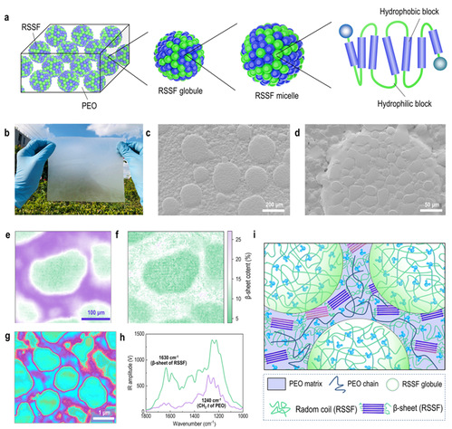 天然纺丝过程中,丝蛋白在丝腺体内组装成丝蛋白球,并在拉伸、剪切力等作用下形成纳米纤维,最后形成具有多层级介观结构的丝纤维。该研究中使用再生丝素蛋白(RSSF)/聚氧化乙烯(PEO)模拟天然纺丝原液中的相分离体系。随着干燥过程中溶液浓度增加,RSSF胶束组装成与天然丝腺体中相似的球状结构。通过调节溶液组成比和/或溶剂蒸发率,RSSF小球的直径可以在0.5-200 μm的范围内调控,最终制得仿生介观组装薄膜(BMAFs)。这些薄膜在宏观上均匀且无缺陷;而在介观尺度上表现出清晰的相分离结构(图1)。