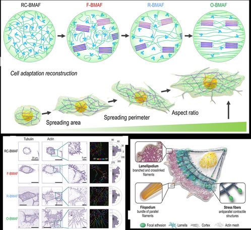 图3:训练过程中BMAFs的力学性能变化及与各生物软组织力学性质对比。在生物组织工程中,基质可以通过影响细胞的形貌从而影响细胞的生理功能,因此基质材料的微观结构及力学特性都十分重要。本研究表明BMAFs对293T细胞和HeLa细胞具有优异的粘附性,且细胞的各向异性随着BMAFs取向度的增加而增加。HeLa细胞在BMAFs上调整结构的方式涉及细丝的空间重组和聚合调制(图4)。
