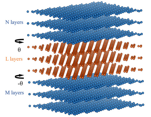 图1:交错转角多层石墨烯示意图。该体系由三组多层石墨烯组成,每一组内由任意堆垛方式的多层石墨烯构成,并在两组之间形成交错的转角。