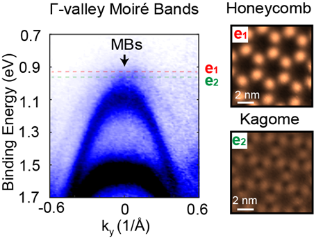 转角过渡金属硫族化合物(tTMDs)被预言为一类可实现多种可控量子模型的材料平台,其倒空间不同位点的莫尔能带可用于实现多种基本哈密顿量的模拟,包括三角型、蜂巢型、笼目型等。此外,已有输运实验证据显示,转角WSe2中的价带顶附近的莫尔能带在不同填充条件下可以实现强关联绝缘态和零电阻态。然而,人们仍不清楚莫尔能带在动量空间的电子结构和对应的实空间电子分布。