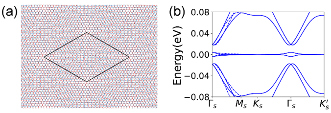 图1 (a)转角双层石墨烯体系摩尔超晶格示意图,(b)及其非相互作用能带
