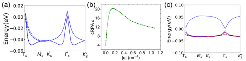 刘健鹏组利用连续模型、约束无规相近似、非约束平均场计算、非线性响应理论等理论计算方法,系统研究了魔角双层石墨烯体系平带在整数填充和分数填充下的关联绝缘态和密度波态的新奇物性。理论计算发现,高能子空间的库伦势能会在平带中引入粒子空穴非对称性,并显著增强平带色散(图2a)。该工作中,研究人员还发展了约束无规相近似的方法,考虑了来自于高能子空间的虚拟粒子-空穴激发对低能子空间电子间库伦作用的屏蔽效应(图2b),进而可以更准确地处理低能子空间的库伦相互作用效应。在保持摩尔晶格平移对称性的前提下,计算得出的在整数填充下的相互作用单粒子激发谱(图2c)体现出很强的粒子空穴对称性的破坏。这很好地解释了该体系在扫描隧道谱和逆压缩率(inverse compressibility)测量中所展现出的一系列级联转变(cascade transition)现象。