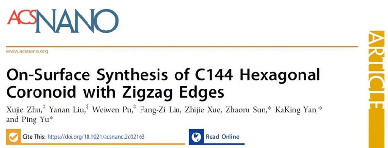 于平课题组、甄家劲课题组和孙兆茹课题组合作,首次在金表面上成功合成C144锯齿形边缘的冠状六角烯分子,该成果发表于国际知名学术期刊ACS Nano。