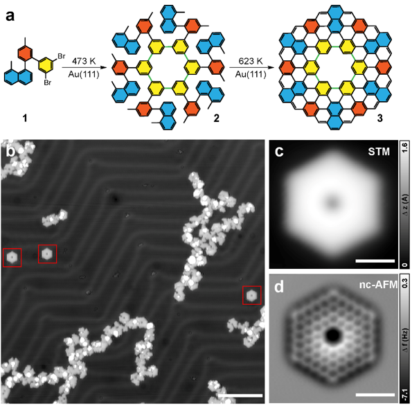 针对这一难题,联合团队设计了特殊的具有表面手性的前驱体分子1,在金表面上通过乌尔曼偶联以及脱氢环化反应,首次成功合成出了C144锯齿形冠状六角烯。通过采用低温超高真空环境下扫描隧道显微镜(STM)和非接触式原子力显微镜(nc-AFM)对C144锯齿形冠状六角烯化学结构进行精确表征(图1),进一步分析了缺陷的产生原因——由前驱体分子1的不同吸附手性及非对称性的结构引起。