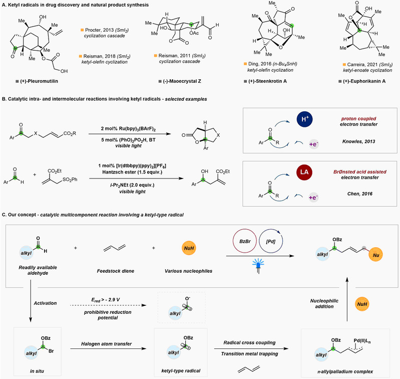 实现原子经济性、步骤经济性一直是合成化学家们追求的目标。由于可以一步构建多个化学键,多组分反应已受到化学家们的广泛关注。羰基自由基是自由基化学领域中一类比较重要的反应中间体,在全合成领域有较大的应用,如何在催化条件下实现相关的化学转化一直是合成化学中的一个难点 (图1)。