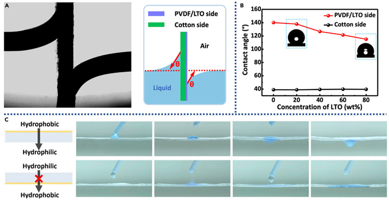 刘巍课题组开发了一种具有定向水渗透功能的复合不对称非织造材料(composite asymmetric nonwoven, CAN),CAN由一层含有锂离子筛(钛酸锂)颗粒的疏水(聚偏氟乙烯)纤维层和一层亲水(棉)纤维层组成(图1)。利用亲/疏水纤维构建润湿梯度,直接依靠溶液重力与材料自身的毛细管压力差,该材料可引导液体穿透材料内的曲折孔道与离子筛颗粒接触,无需任何外部驱动力的情况下实现了锂离子的提取(图2)。这项工作有望为节省海水/盐湖提锂的能源成本带来希望。